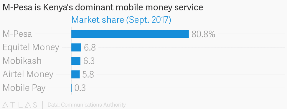 In Kenya last year, M-Pesa’s revenue increased by 14.2%, to nearly 63 billion shillings/$615 million USD. M-Pesa also dominates the country’s mobile money service market: