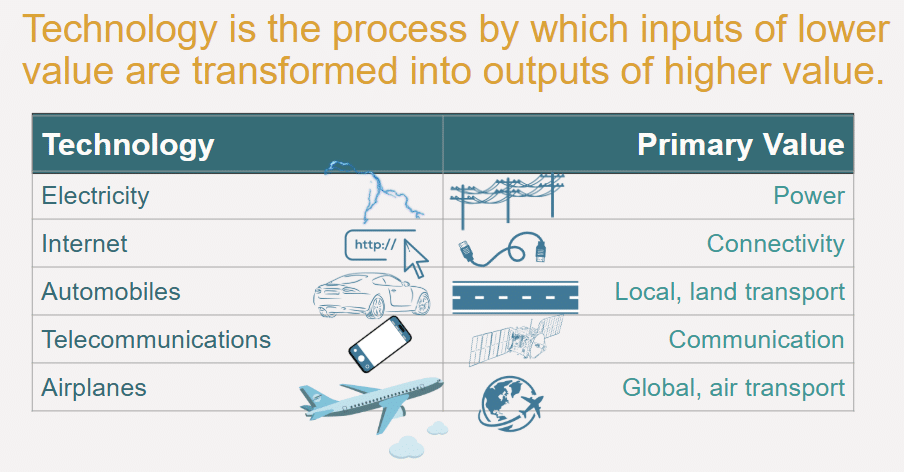 For our purposes, let’s define it as the process by which inputs of lower value are transformed into outputs of higher value. That definition is not only clear, but it also helps us see that technology can be hightech, lowtech, digital, analog, and so on.